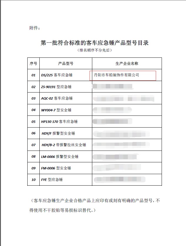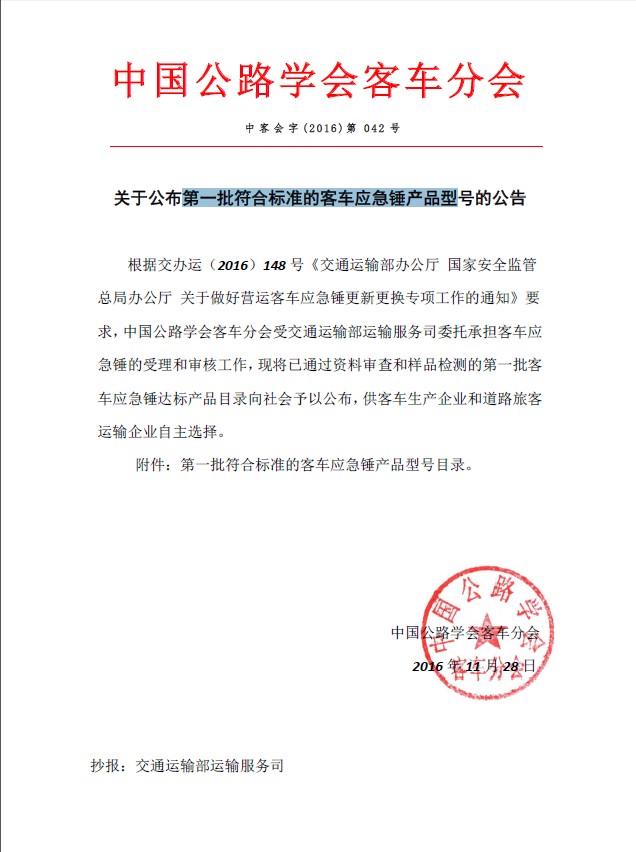 熱烈祝賀我司成為第一批符合標準的客車應(yīng)急錘產(chǎn)品型號的廠家之一